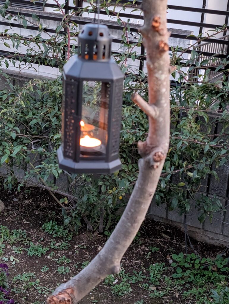 イケヤで購入してきた、ロウソクのランタンを庭に設置しました。揺れる炎は風情があります。1つのロウソクで4時間近く燈り続けました。