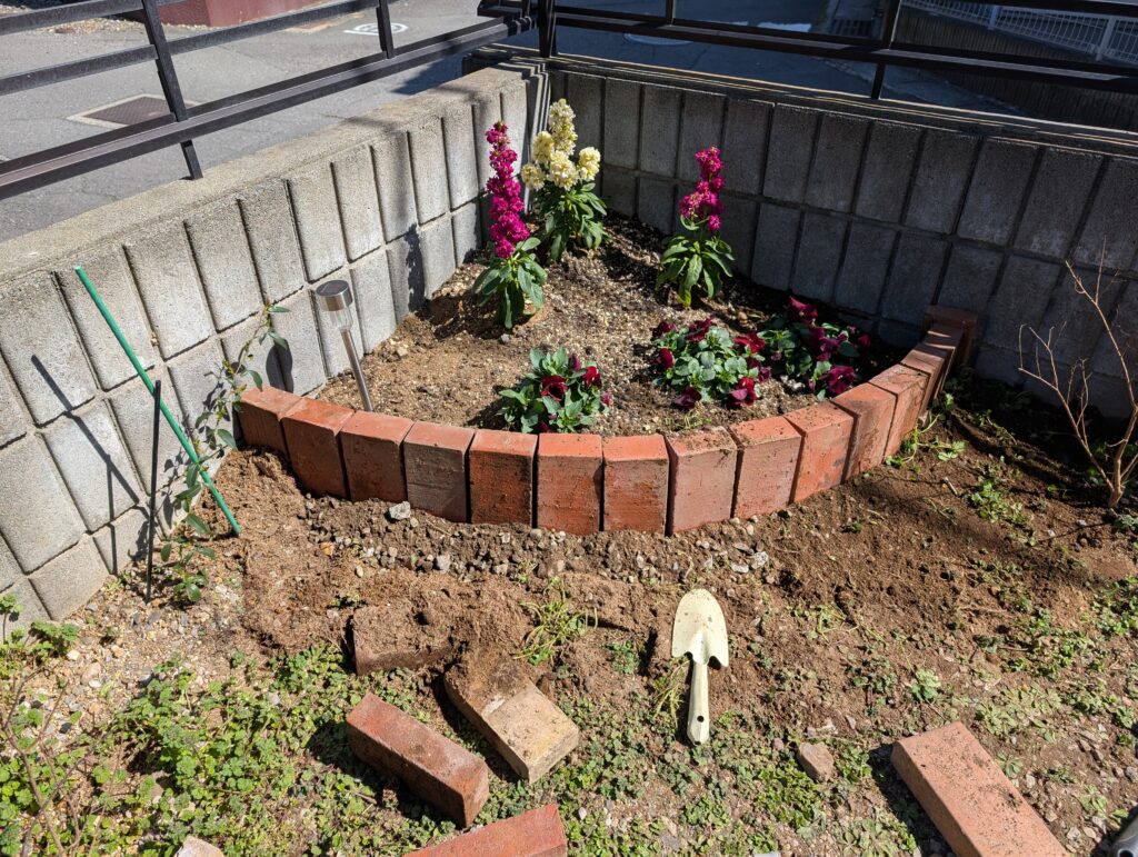 北東側の小さな花壇のレンガを高くしてとのご要望。大き目のレンガに交換し、縦にして積み直しました。