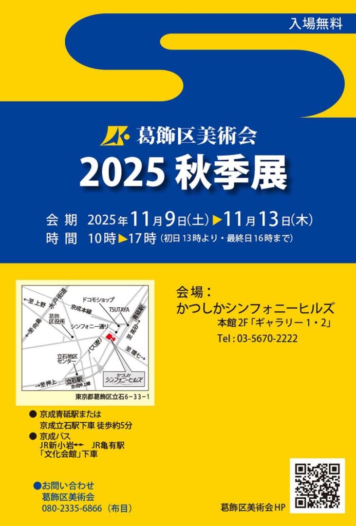 今年も「葛飾区美術会秋季展」を下記の通り開催いたしますので、ご高覧頂きたくご案内申し上げます。 会期:2025年11月9日(土)~11月木13日() 開場:10:00~17:00 初日13:00~ 最終日~16:00 会場:かつしかシンフォニーヒルズギャラリー Ⅰ Ⅱ 主催:葛飾区美術会 責任者:宮澤 賢一 お問い合せ:web-master@katsubi.org