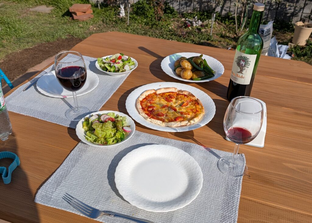 ガーデンレンガ敷終わりました。その完成を祝ってピザランチで乾杯。
