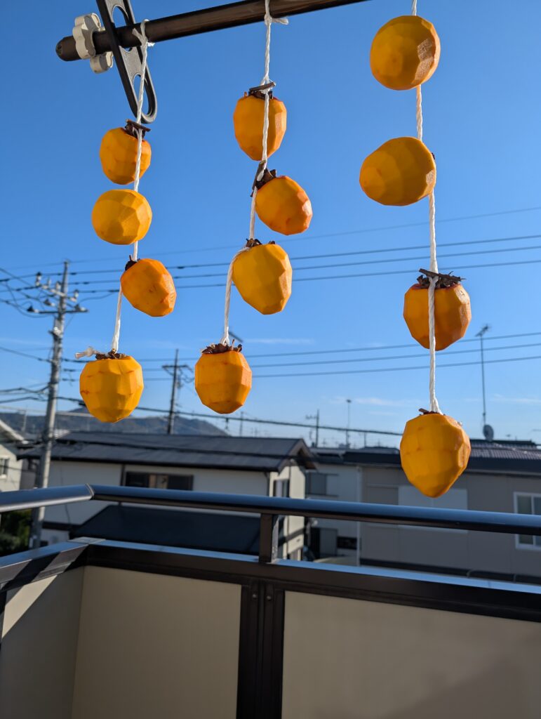 足利IC近くの物産館で干し柿用の柿を見つかました。家に帰り早速、購入した柿の皮をむき、湯煎して二階の物干しに吊るしました。