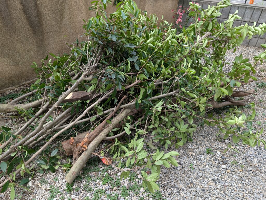 お隣さんとの境界の木が通行の妨げになるので伐採しました。