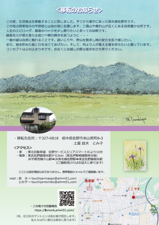 足立区から栃木県佐野市へ移転するお知らせの原稿を作りました。気が早いですが、様々な手続きや引っ越しの準備があるので、出来ることは早めにとの考えです。