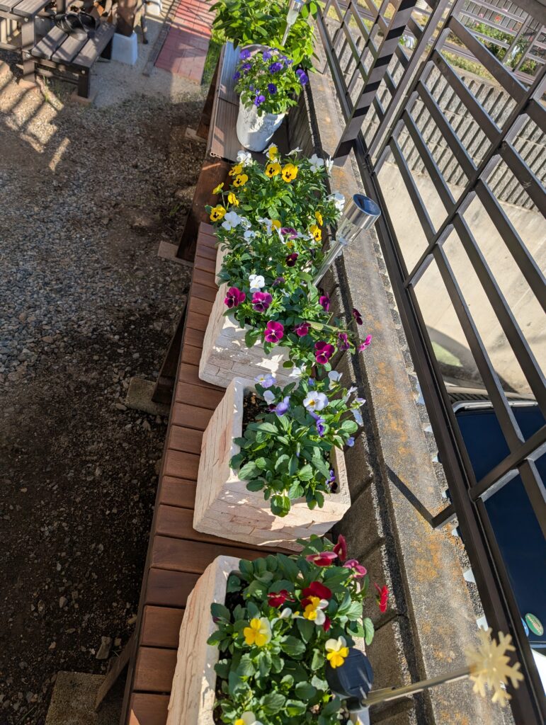 花台を2つつくりました。その上にのせた植木鉢には山ホトトギス、ミニバラ、ビオラを植えてみました。
